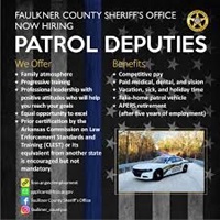 The Faulkner County Sheriff’s Office is currently hiring patrol deputies, offering competitive pay along with benefits that include paid medical, dental, and vision coverage, vacation, sick and holiday time, a take-home patrol vehicle, and APERS…