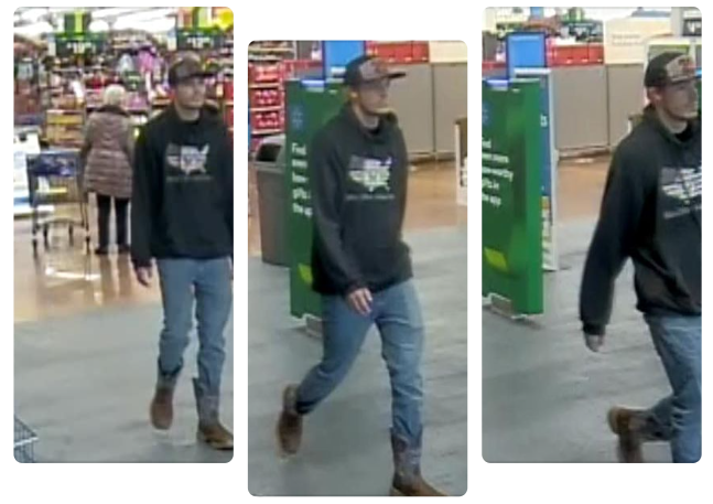 In the photograph released, the subject is seen wearing a ball cap and hoodie while exiting a store.