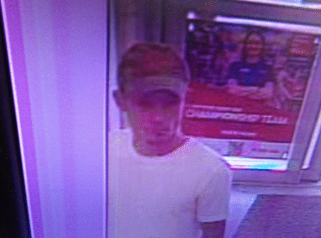The individual was captured on camera, wearing a white shirt and standing in what appears to be a store. Authorities believe he is connected to a theft incident in the area.