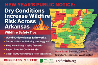 As Arkansans celebrate the start of 2026, officials are urging the public to use caution outdoors as dry conditions have increased wildfire risk across much of the state. Even small sparks from fireworks, outdoor equipment, or open flames can ignite dry grass and spread rapidly.