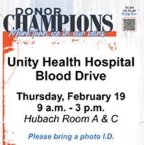 The Donor Champions Blood Drive, hosted in partnership with Our Blood Institute, will take place Thursday, February 19, from 9 a.m. to 3 p.m. in Hubach Rooms A and C at Unity Health.