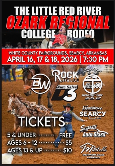 The Searcy Arkansas College Rodeo is set to bring high-energy action to the White County Fairgrounds this week, running Thursday through Saturday with nightly performances beginning at 7:30 PM. Gates open at 6:00 PM each evening.