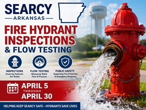 The City of Searcy Fire Department will begin fire hydrant inspections and flow testing across Searcy Arkansas from April 5 through April 30, 2026, taking place daily between 8:00 AM and 3:00 PM.