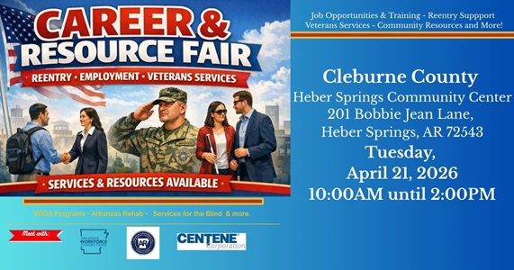 The Arkansas Division of Workforce Services is hosting a Career and Resource Fair focused on veterans, reentry support, and employment opportunities in Heber Springs, Arkansas.