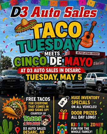 D3 Auto Sales Taco Tuesday Cinco De Mayo Event Des Arc Arkansas May 5 2026 Free Tacos & Prizes