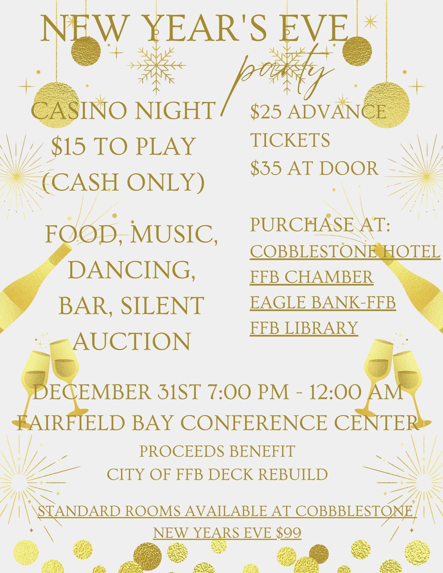 Fairfield Bay, AR – Fairfield Bay is ringing in 2025 with a vibrant Casino Night at the Fairfield Bay Conference Center on December 31, from 7:00 PM to midnight. Tickets are $25 in advance or $35 at the door. Guests can enjoy casino games, live music, a silent auction, and a bar. Proceeds will support the city’s deck rebuilding project. Casino games include poker, blackjack, and roulette, with cash-only play. Local accommodations are available at Cobblestone for $99. Purchase tickets at the FFB Chamber, Eagle Bank, or FFB Library for an unforgettable New Year’s Eve celebration.