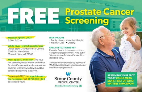 White River Health is offering a FREE Prostate Cancer Screening at Stone County Medical Center on Monday, 4-6-2025 from 5:00 PM to 7:00 PM.